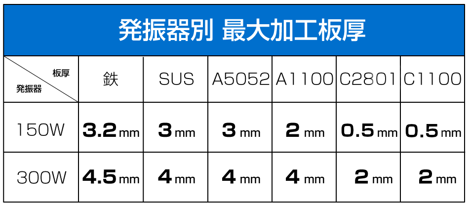 - 加工板厚:20μ箔から4.5t(SS材300W機) アルミは3mmまで(300W機)